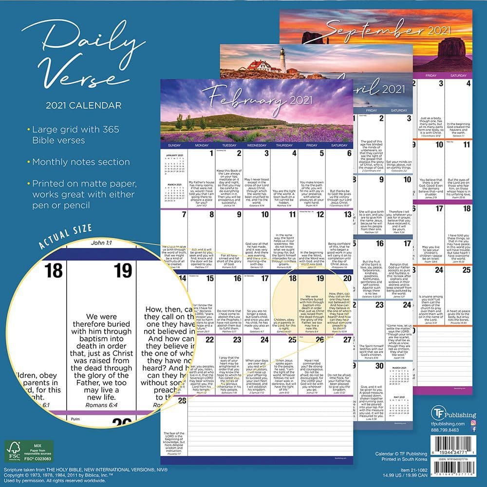 For over 30 years, the 365 bible verses calendar has started every day off with a welcoming verse of wisdom, joy, and comfort. It's our free printable monthly planner with bible verses to inspire you every month. Everyday low prices and free delivery on eligible orders. Cited chapter and verse from the king james version of the bible, each day. Read more and get your free download now! Hi there, we have updated our bible verse calendar for 2021! Free shipping for many products! Comfort and inspiration from an eternal source, every day of the year. A feast for the eyes and food for the soul, this perennial favorite pairs a daily message of wisdom, comfort, and faith from the majestic kjv with breathtaking images of god's creation. Calendar (box calendar) $ 15.99. Hope they will return to green next year. Comfort and inspiration from an eternal source, every day of the year. For ye are all the children of god by faith in jesus christ $15.99 this title will be released on august 24, 2021.